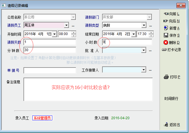 张三登记为04-19 与 04-20 两天请假,实际应为16小时.系统自动计算为1天9时30分,如图所示.
