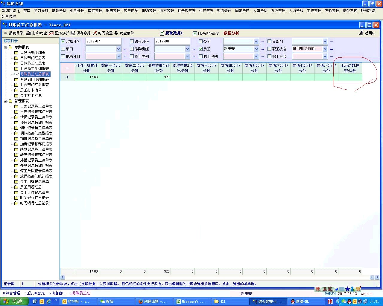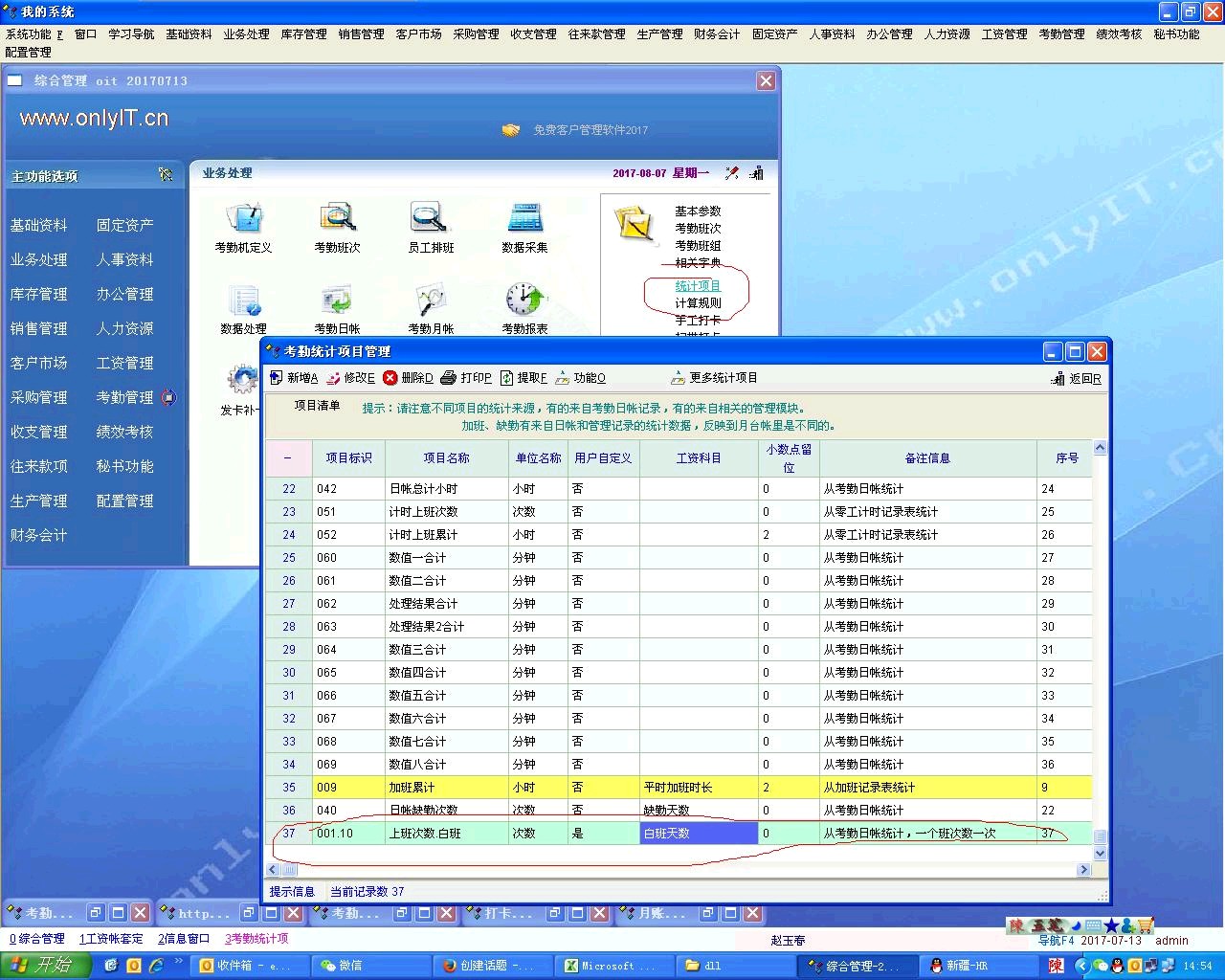 在“考勤管理”-->“统计项目”中添加了001.10白班天数项目,并对应了工资科目。但“考勤月帐”中无法显示刚才添加的001.10白班天数项目的计算结果,并且在“考勤报表”-->“月帐员工汇总报表”中未正确显示,请问如何解决,谢谢!