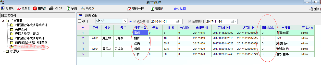 有个问题请教, 在数据脚本中,通过办公事务流程记录查询产生请假明细,其中请假类别及审批状态,这两个内容,都需要从App_dict_def中关联查询,看起有问题,目前调试结果是 一头可以,另一头 没找到办法。