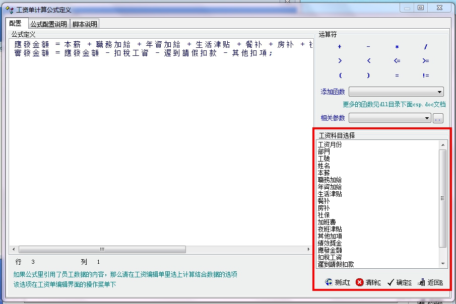 若提醒為 "分析脚本时出错了,错误信息:main(line num 1): parameter 應發金?not defined 参数没有定义 (run_line(應發金額 = 本薪 + 職務加給 + 年資加給 + 生活津贴 + 餐补 + 房补 + 社保 + 加班費 + 夜班津貼 + 其他加項 + 績效獎金;),行号:1"