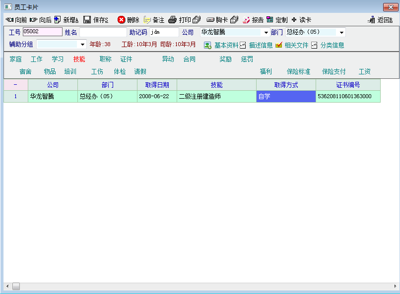 也就是说希望在”人事资料“中的员工资料录入时,录到分类信息中的“技能”时,希望在”技能“和"取得方式”之间增一列,定义为”专业“,因为我图示中的”二级建造师“会分为”机电工程、市政工程“等专业,但是在录入时无法区分。