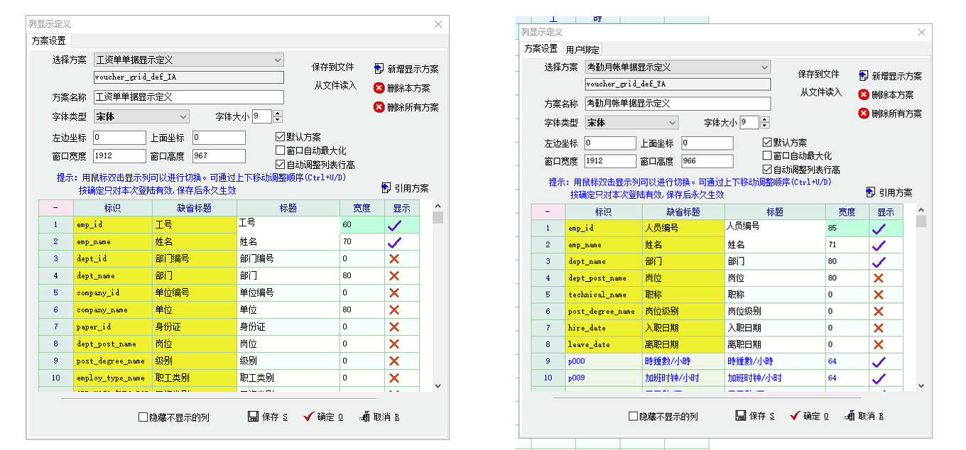 系统中在员工信息页面有员工工号和考勤卡号两个不同的编号,这个非常有用,对于有多个营业场所的公司来说,员工工号是唯一的,但员工可能会在不同的场所中流动工作,因此考勤卡号并不唯一,并且,在计算每个场所的工人工资时,希望员工在哪个场所工作的,其工资就在哪个场所核算,工资核算的依据是考勤卡号(由于情况特殊,各场所的考勤卡还是纸钟卡)。所以,希望在考勤月账的“明细列表显示定制"中,以及工资账薄的”明细列表显示定制“中,可以将考勤卡号显示出来。