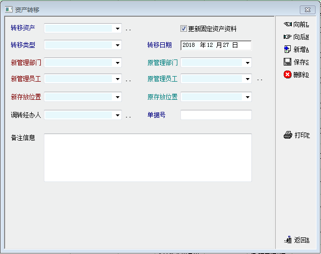 资产管理软件中资产转移建议增加使用状态选项,因为在调转过程中资产可能有使用中变成闲置或则其他状态,因此建议在资产转移选项中可能更改资产状态。