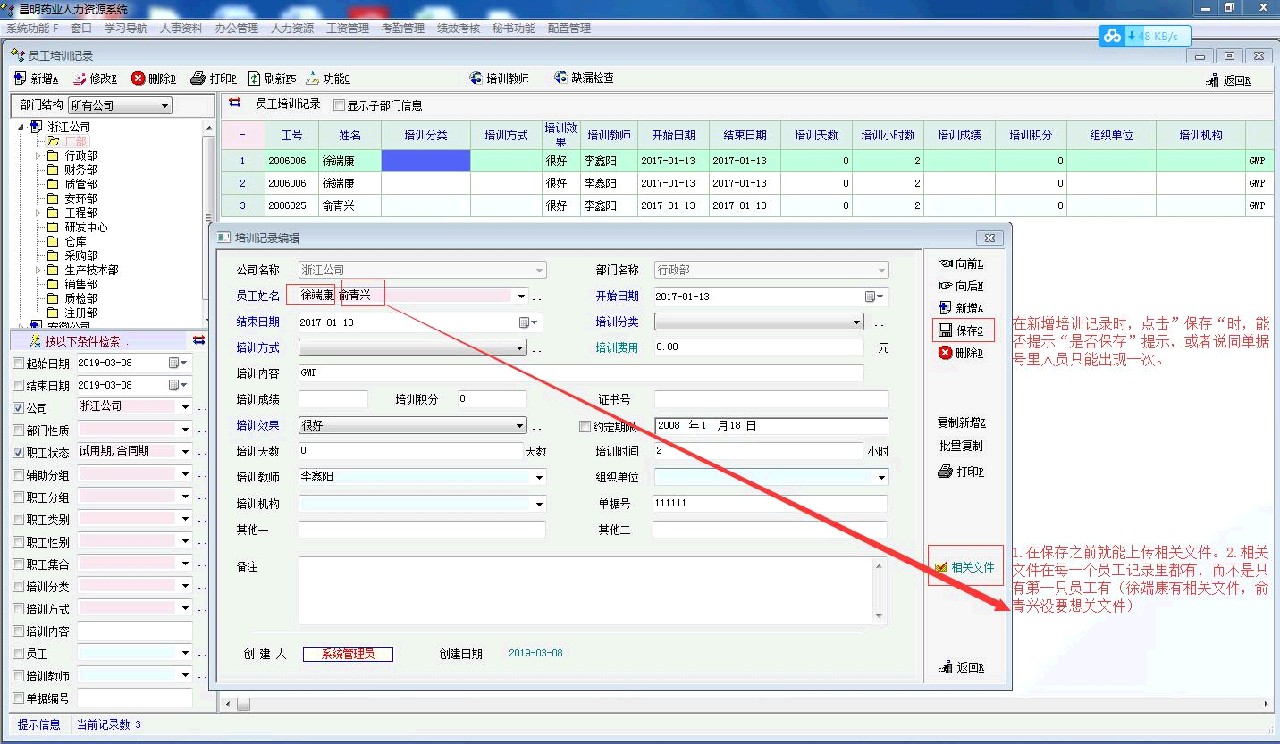 2.在添加相关文件时,要求先保存,而且相关文件只能生成一条记录里面。(如有一个30人的GMP培训,有一个KK的相关文件,30条记录里面只有一条有相关文件)