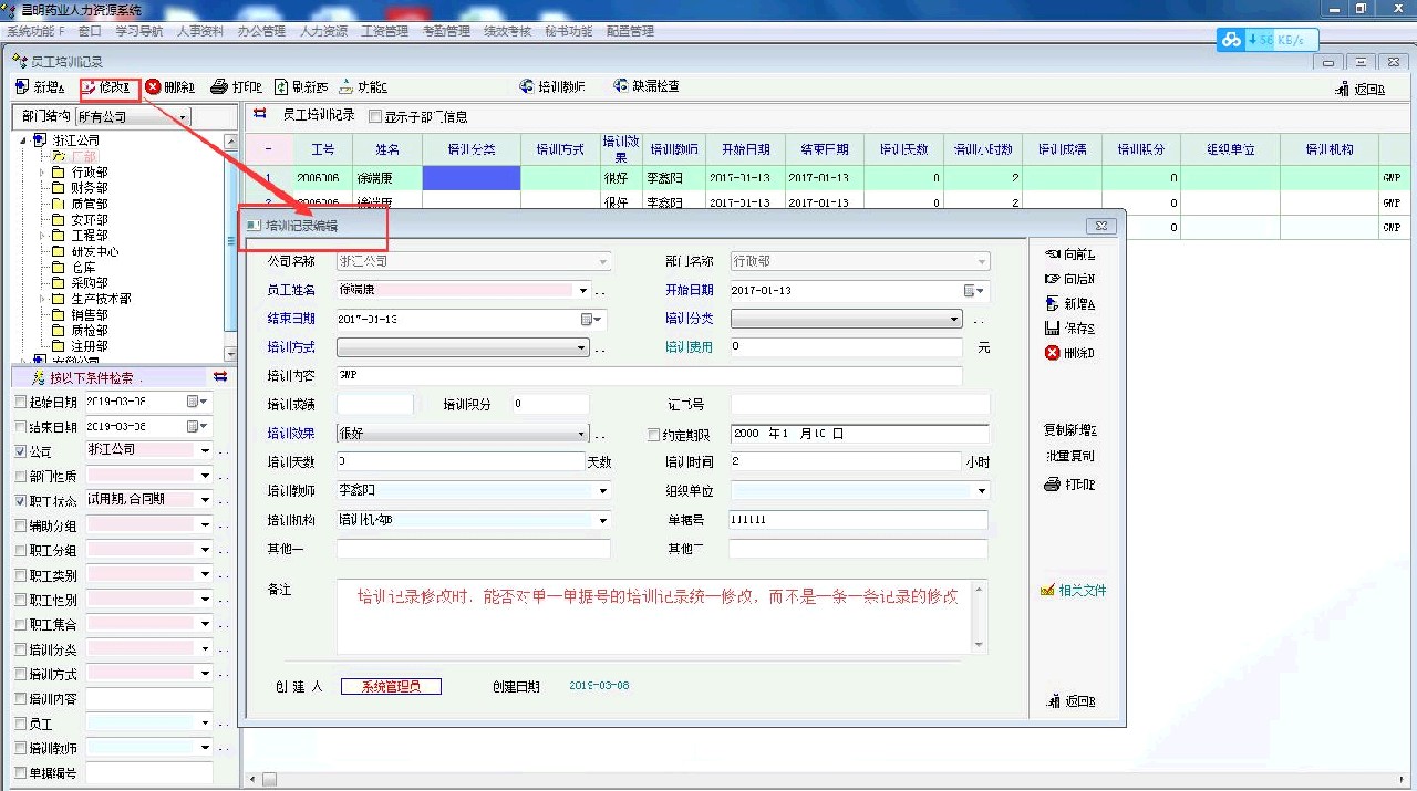 3.在修改相关培训记录里,只能一条一条修改,不能对同一单据号的相关记录统一修改。