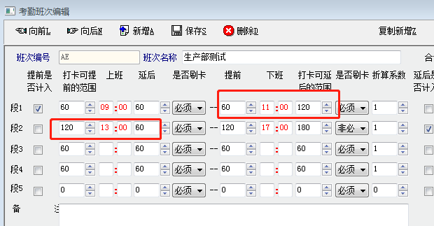 2、员工中午吃饭时间为半小时(超过半小时为扣款),不固定吃饭时间段 (一般在10点半到2点半之间),班次设定模块中,假设设置11点为下班,延后2小时,13点为上班提前2小时,能否11点到13点之间打的两次卡的[优先级]取消掉,各自读取最靠近的读数呢?