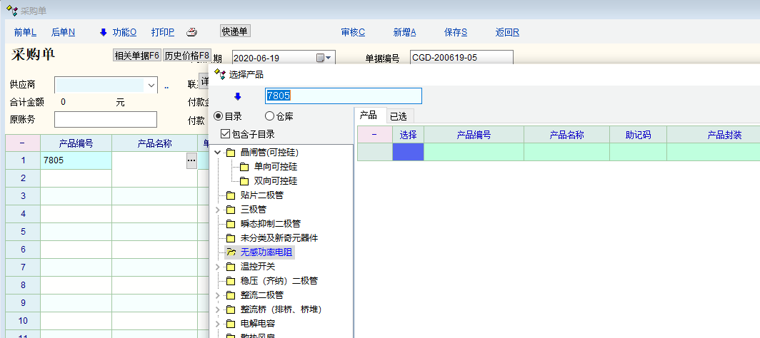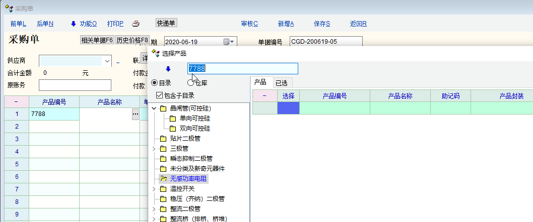 系统中存在7805这个产品,7788则不存在。如图,输入系统中不存在的产品7788,系统弹出选择产品窗口,显示不存在这个产品。再次输入正确的产品7805,物资单据(采购单)还是只显示不存在的产品7788,并没有输入正确的7805产品。
