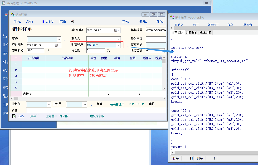 目的是通过控件值来实现不同的列显示与隐藏,但测试会闪一下后被再覆盖。 int show_col_ui() { string zh; zh=gui_get_val("ComboBox_Ext_Account_Id"); switch(zh) { case '01': grid_set_col_width("MG_Item","a1",0); grid_set_col_width("MG_Item","a2",0); grid_set_col_width("MG_Item","a3",20); grid_set_col_width("MG_Item","a4",20); break; case '02': grid_set_col_width("MG_Item","a1",20); grid_set_col_width("MG_Item","a2",20); grid_set_col_width("MG_Item","a3",0); grid_set_col_width("MG_Item","a4",0); break; } return 1; } int func_show() { show_col_ui(); return 1; }; int obj_change() { //change_obj if (change_obj=="ComboBox_Ext_Account_Id") { show_col_ui(); } return 1; |