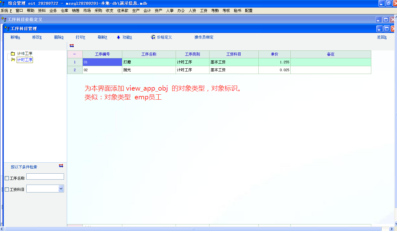 老师能否为“工序科目管理”界面,增加 view_app_obj 的  对象类型,对象标识;方便快速新增工序明细。