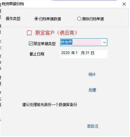 建议物资单据归档增加限定客户(供应商)功能。每一个客户的重要性和业务资料,单据多少各不相同,对单据就行归档,特别是清除时要求的时限是各不相同的。比如重要客户或有特殊原因的一些客户的单据可能需要保存10年,不重要的客户可能一两年就够了。如果所有的单据归档,尤其是清除时统一限定时间就失去了灵活性。