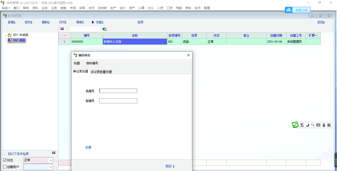 现在弹出界面,输入老编号,新编号,物料编号不容易记住,这个功能不太方便