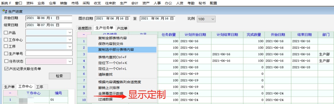 生产进度查询增加“显示定制"功能