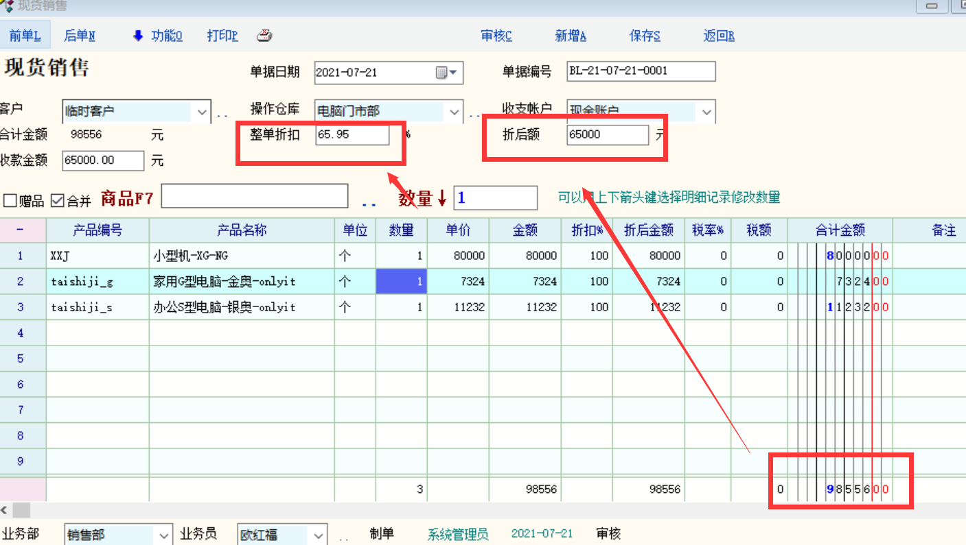 如手动更改每个产品的折扣和成交金额,又因为小数点导致整单金额与实际金额有点偏差