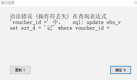 如果设置了引入凭证模板,由单据生成凭证后,尽管可以通过单据查询对应的凭证,但是必须在单据打开状态下才可以,并且不能批量查询,因此以进销存单据为例,在单据列表中启用“扩展一”,改名为“凭证号”,结合如下脚本,就可以在单据列表界面查询对应的凭证号了。 int load_over() { int i,n; string a,b,c,sql; n=grid_row_num("MG"); for(i=1;i<n;i++) { a=grid_get_v("MG","voucher_id",i); sql="select * from evm_imp_lst where org_voucher_id ="+a+""; db_run(sql); b=db_res(1); if(b!="") sql="select * from evm_v where voucher_id="+b+""; db_run(sql); c=db_res(3); sql = "update ebs_v set ext_1 = '记"+ c+"' where voucher_id = " +a; db_run(sql); db_run("commit"); } return 1; }; 脚本不太熟悉,可能比较粗糙,勉强能达到效果,运行起来速度有点慢,哪位朋友有兴趣可以再优化一下。 |
