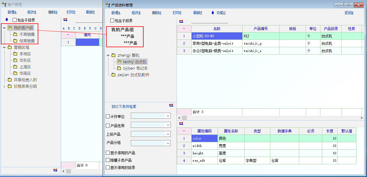 如图,希望在后续更新中 产品资料管理 界面中,能和 客户管理 界面如“我的客户组”一样能增加“我的产品组”