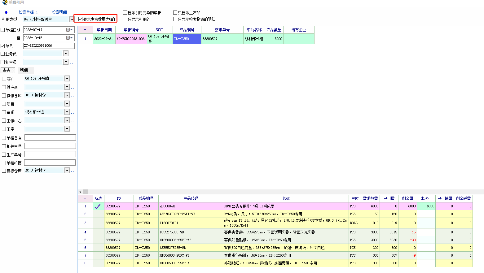 老师,Ctrl+T模式扫描上级单据编号条码之后不会弹出剩余量为负数的行,F6单据引用界面提取单据后,双击单据列表行还是会把明细剩余量为负数的值添加到本次引列,是否可以修正为双击单据列行之后,只把大于0的【剩余量】赋值到【本次引】列