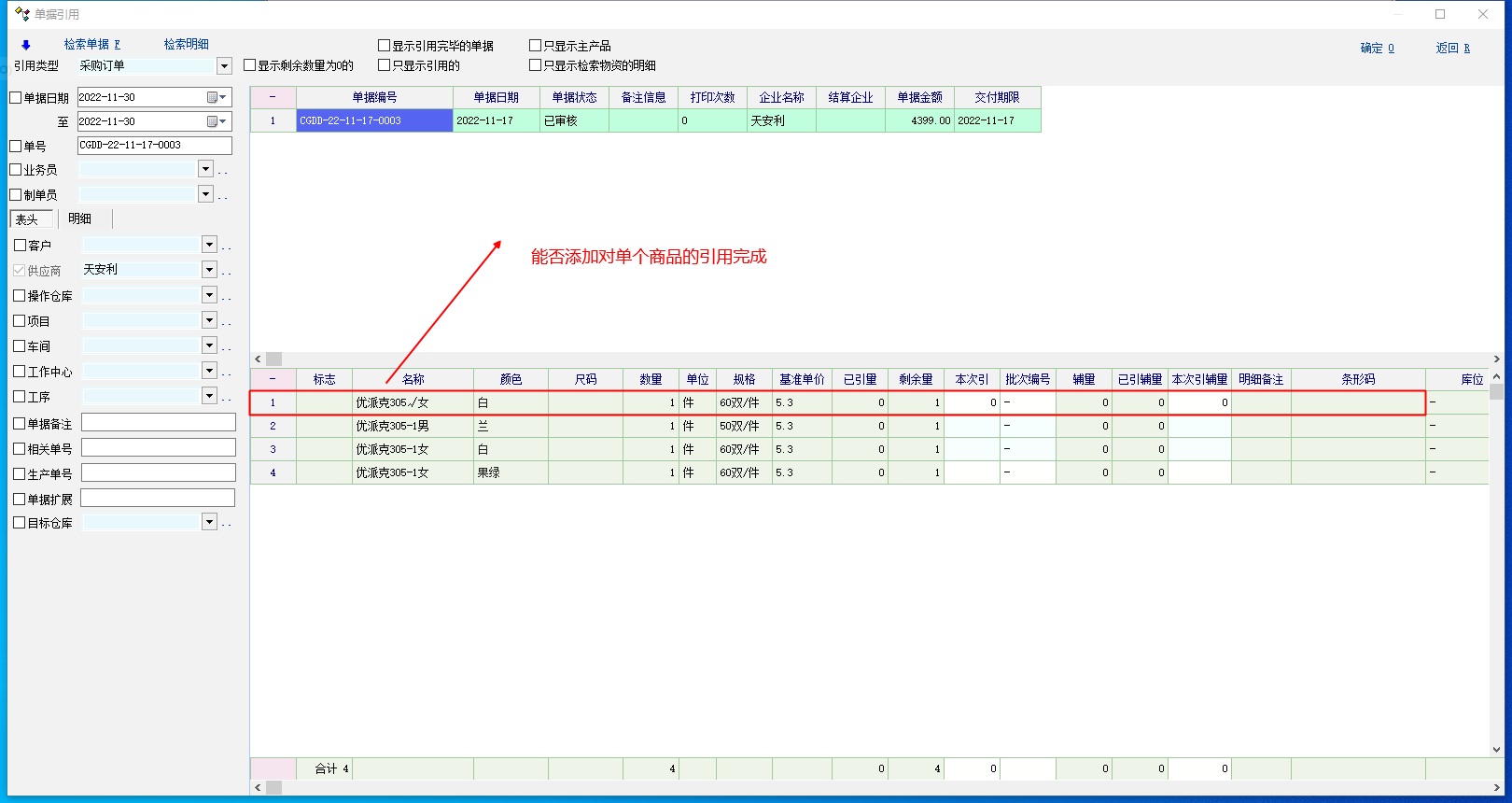 在引用单据里能否对单个商品设置引用完成