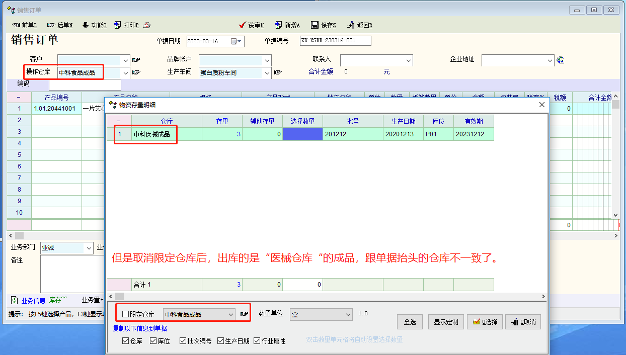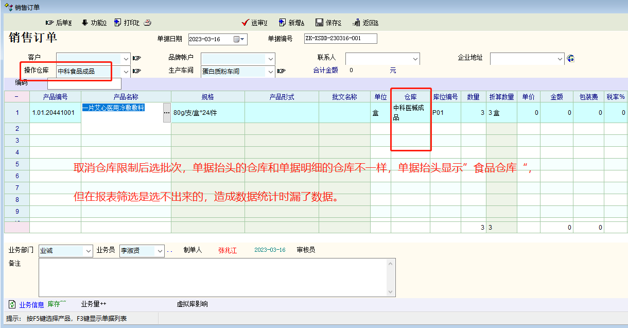 1、例如取消限制仓库,造成的问题:这张单据正常是在A仓库出库,因为取消了限制仓库,跟单可以出B仓库的库存,一方面是操作不规范,另一方面是造成数据统计错误,因为这张单的抬头明明是A仓库,但是财务在导数据时选A仓库时是没有这张单的信息,因为实际是出了B仓库的库存。