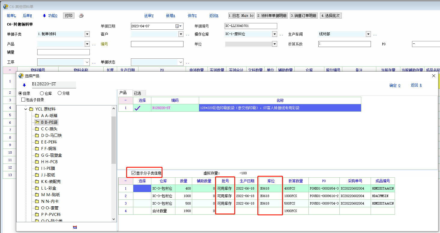 最新版本20230406勾选【显示分子类信息】后是可以正常显示批次和库位的