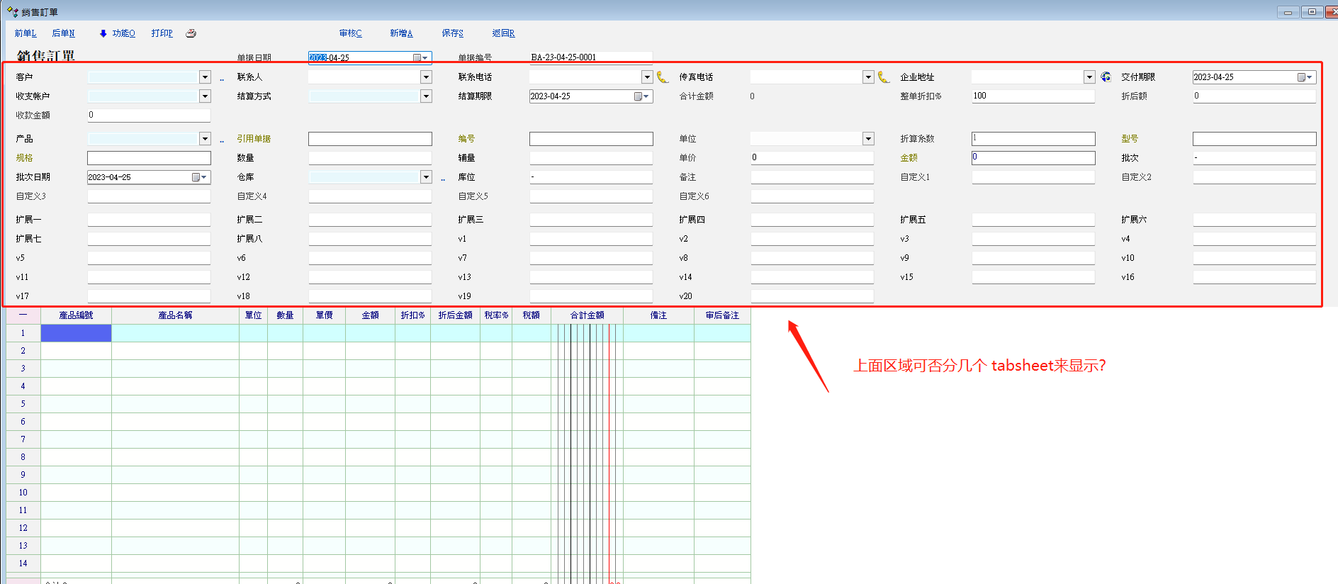 是的,可以尝试添加几个控件来切换表头内容,例如区分【客户信息】,【主物资信息】,【基本扩展信息】,【附加扩展信息】,【全部信息】等