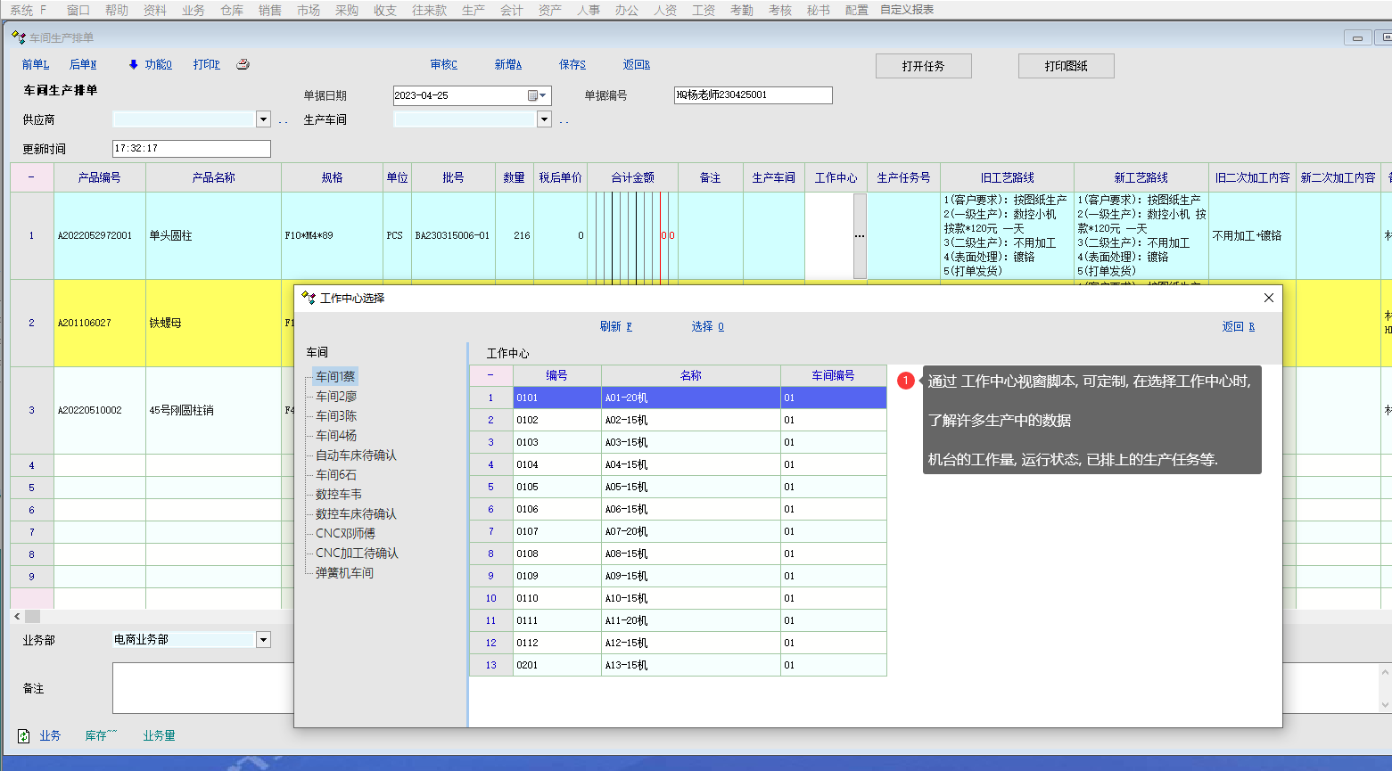 目的: 在单据中选择工作中心时, 定制增加许多和生产有关的数据, 例如机台的生产任务, 工作量, 负荷状态等.