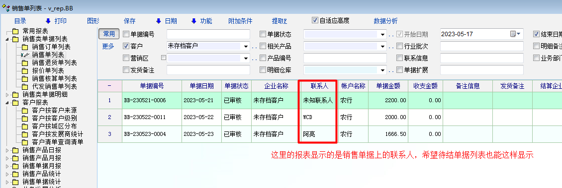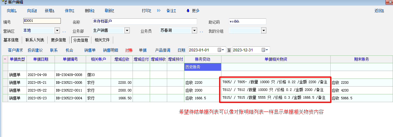 如图片所示,希望改进两个细节。1、待结列表中的联系人能与物资单据中的联系人一致而不是只显示客户资料中的主联系人。2、希望待结列表中可以像对账明细列表一样显示待结单据物资内容。