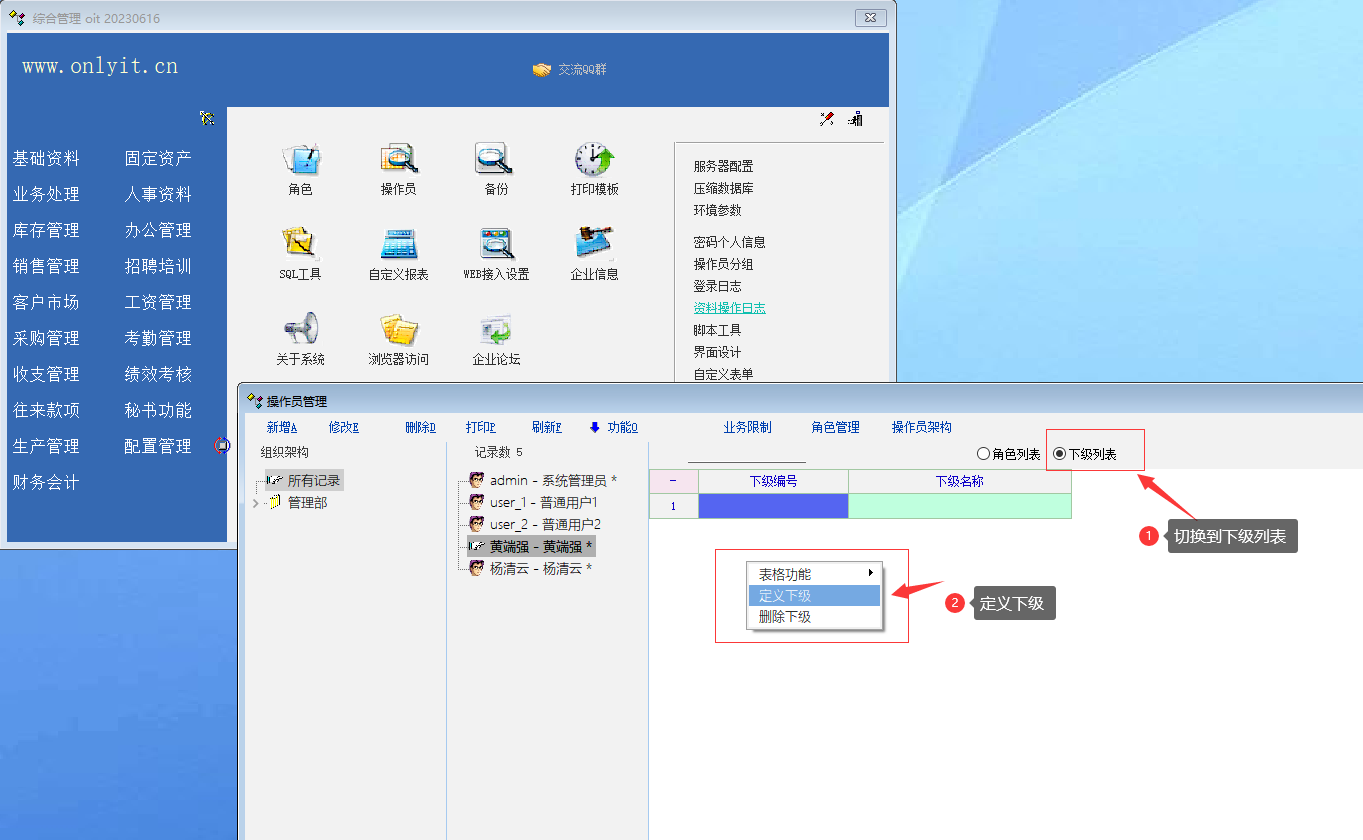 定义操作员的下级, 方便操作其他模块带需要看下级日志, 或是客户联系时.