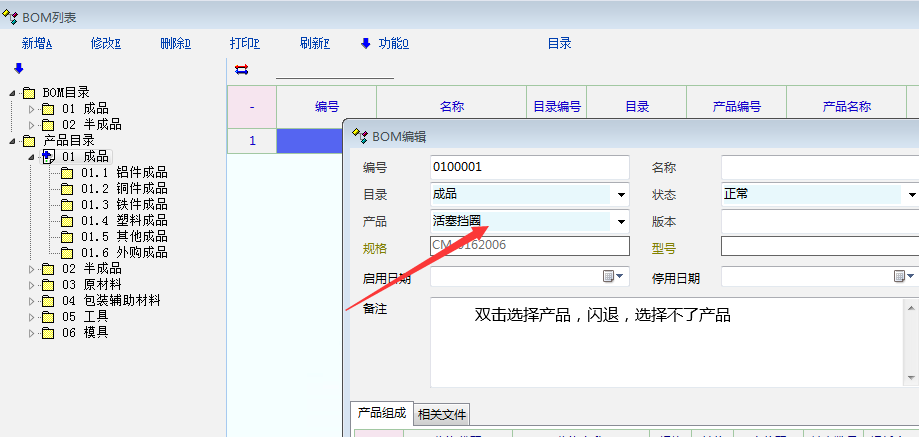 BOM里面新建--双击选择产品--闪退----无法选择具体产品