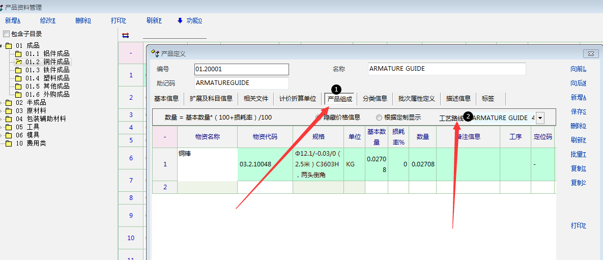 1,产品资料里面直接填写的产品组成,与工艺路线做好后,重新回到产品资料里面选择这个产品需要引用的工艺路线