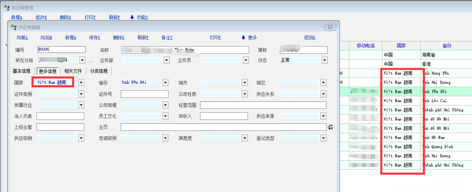 老师,在供应商编辑界面和列表界面,国家栏位的越南文都是乱码,省市是能正常显示越南文,这里也需要优化一下,支持越南文显示,谢谢