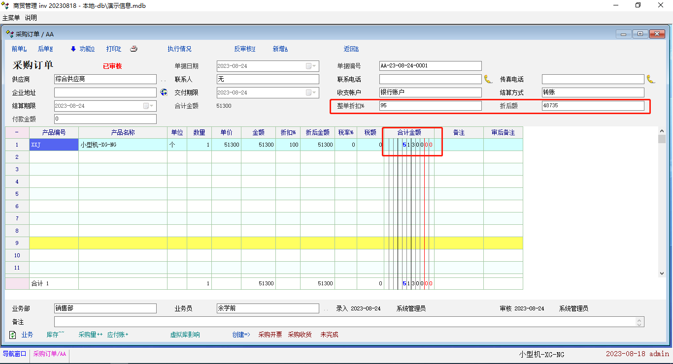 1、采购订单 单据表头 整单折扣%:95,折后额:48735