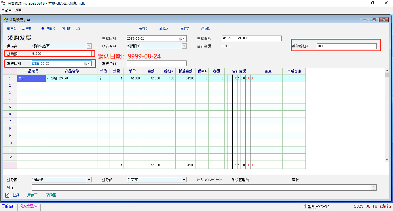 2、采购发票-F6引用后,采购发票 表头 整单折扣%变成:100,折后额:51300