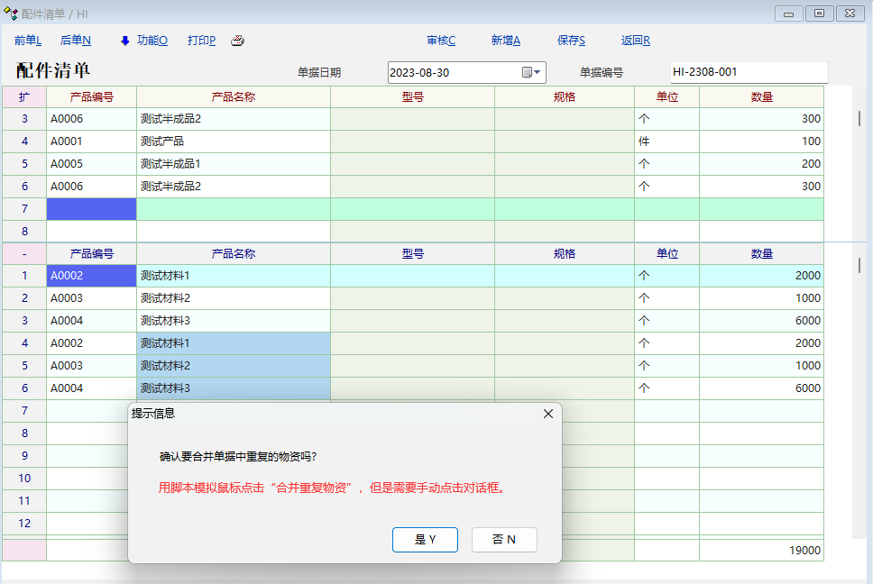 我自定义了一个单据,用来计算配件的用量(不包含半成品),有些配件是通用的,多个产品都会用到,因此存在多个主物资的时候,可能存在重复物资。在用脚本过滤非配件类物资后,就需要合并这些物资,使用gui_trigger_click还需要在弹出的对话框中点击“确认”才行。如果给gui_trigger_click加个参数,比如gui_trigger_click(SI)(控件名称,是否直接确认),这样就会方便很多,比如  gui_trigger_click("Popu_Voucher_Merge_Dup_Res",1);