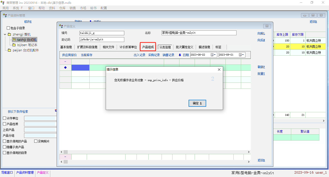 一、产品定义中的 产品组成 是否可以和 分类信息 一样无权限查看信息?