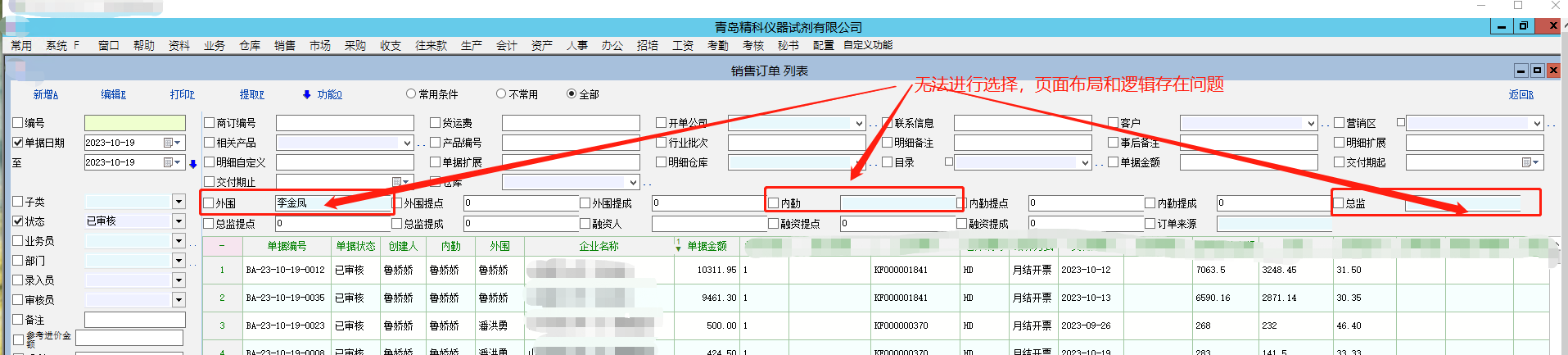 1、描述现状:打开销售订单F3列表页,附加属性定义在显示时,出现有选择框时,无法把选择框显示完整。