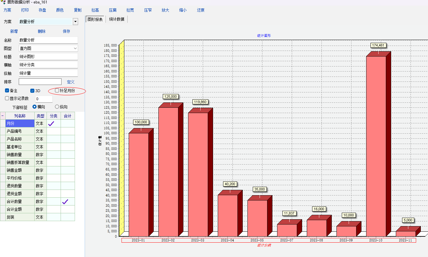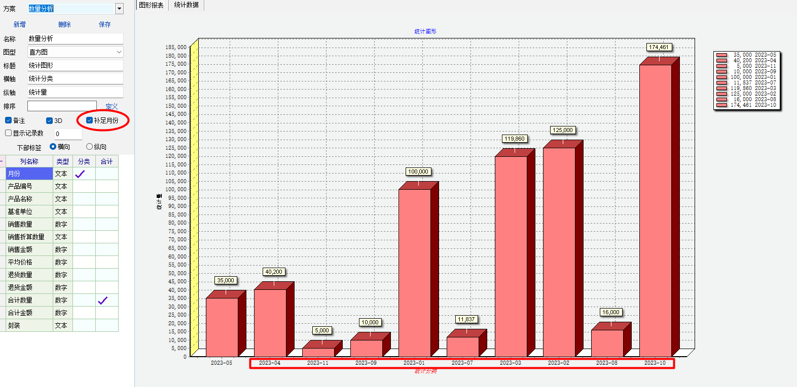如图,图形数据分析中勾选补足月份后图形月份乱序。如果不勾选则是从较早月份到较晚月份排序。