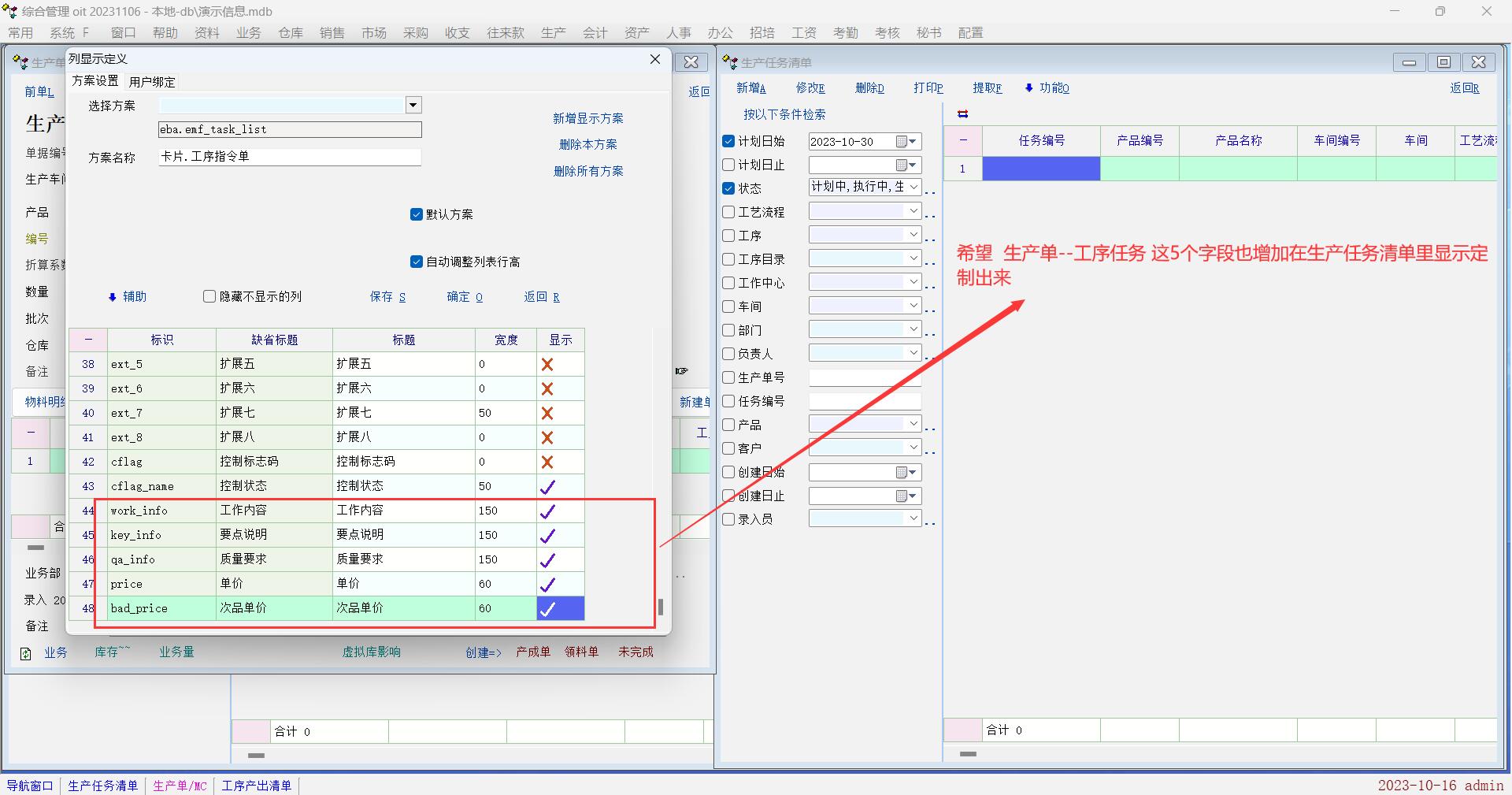 希望生产任务清单增加显示定制生产单--工序任务的5个字段