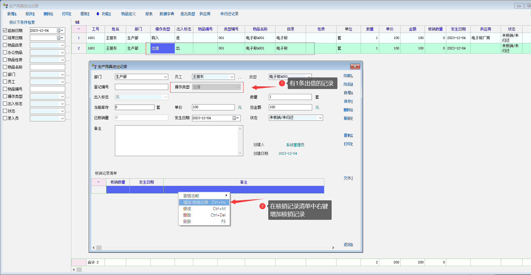 1 出借了一台电子称, 在归还核销时, 右键创建核销记录, 报错. 没有界面.