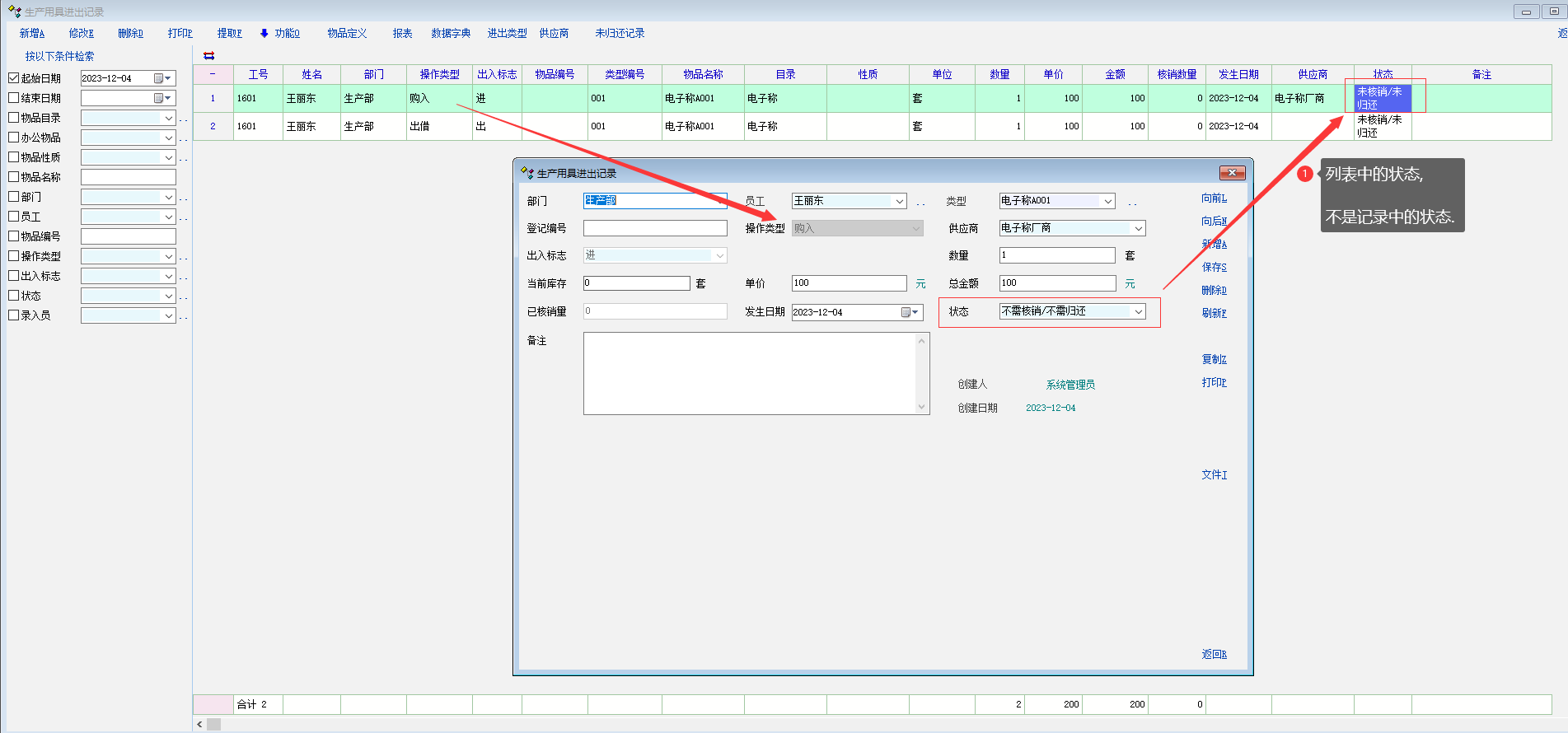 2 用具列表中的状态, 和记录中的状态不一致