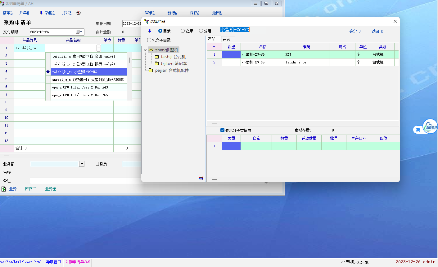 只要在产品名称列输入比如小型机,由于有两个编码不一样但名称一样的小型机,在点击鼠标选择某个小型机的时候,如选择编号为XXJ的小型机,它会跳出选择产品的弹窗来让进行再次选择产品