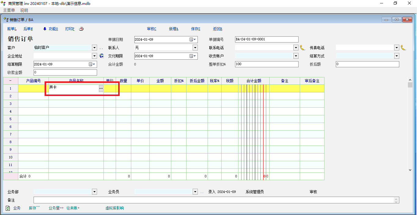 1、销售订单 单据中,输入:声卡,会出现跳不出产品信息的情况。