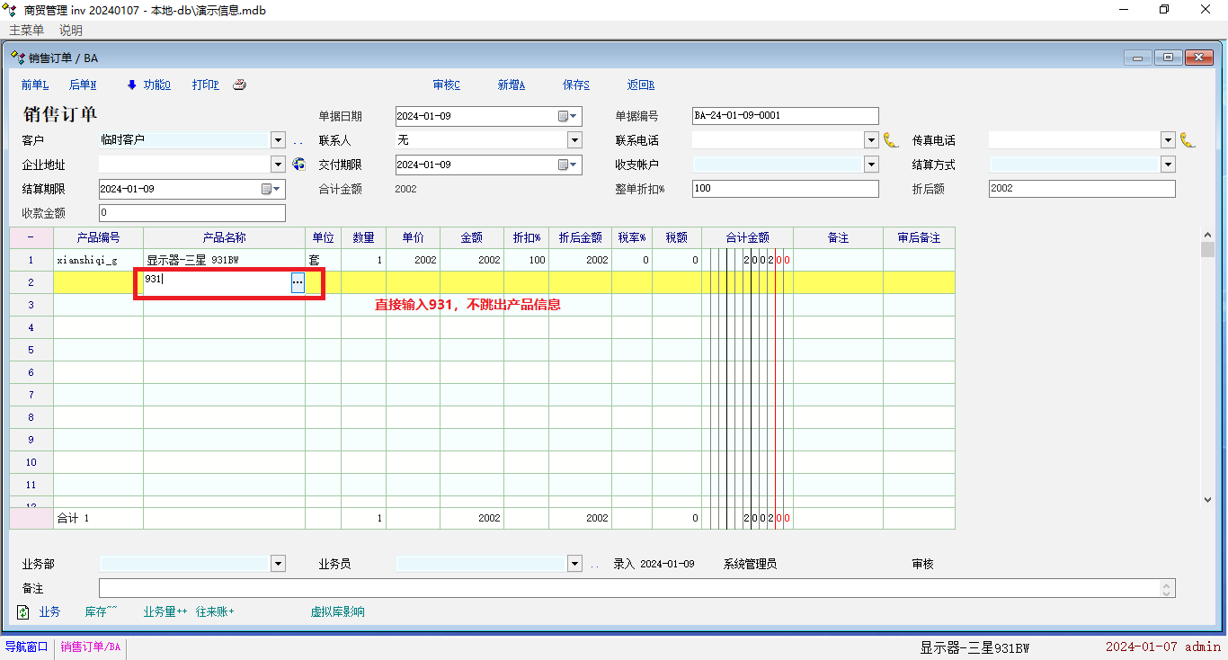 2、销售订单 单据中,输入:显示器产品型号 “931” 这三个数字,会出现跳不出产品信息的情况。