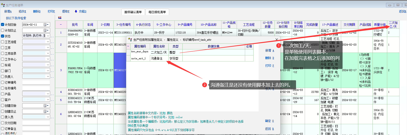 需要自行使用脚本去匹配 emf_task_attr表, 当生产任务一多的时候, 打开生产列表的任务速度就慢许多了。