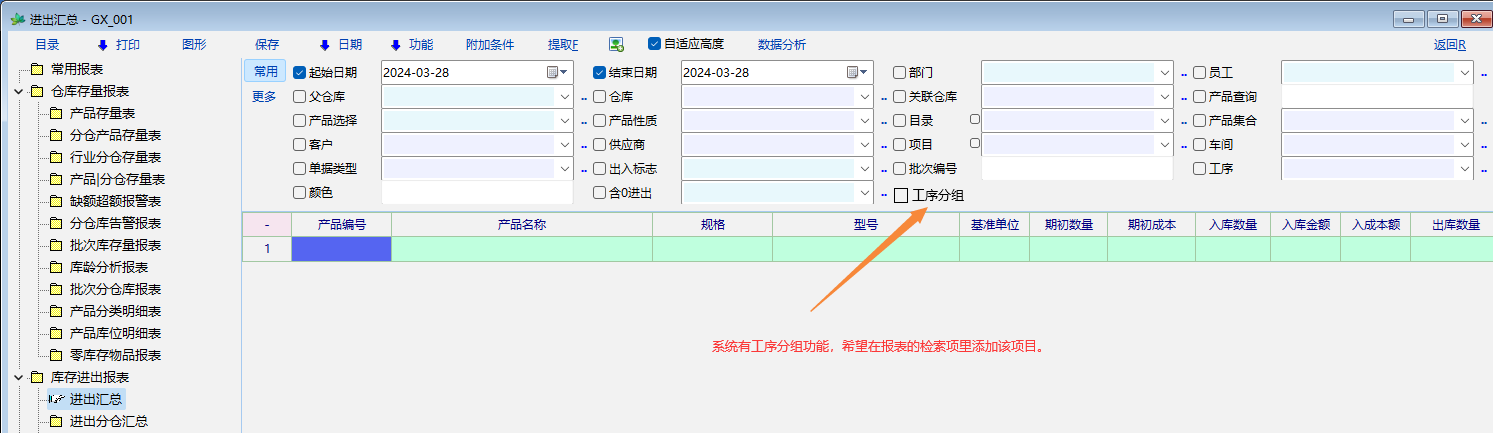 新版本中增加了“工序分组”功能,不过目前相关报表的检索项里并没有该项目,希望能够添加。