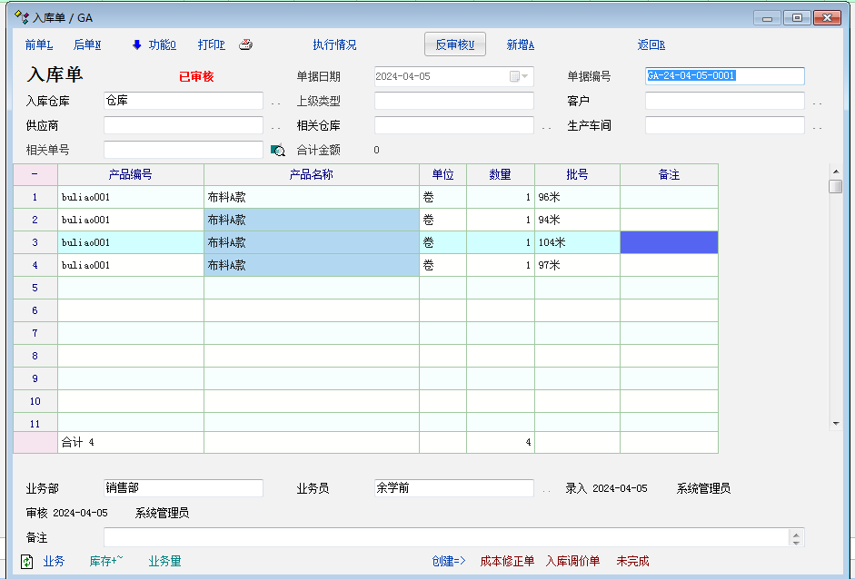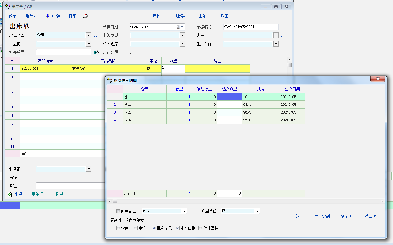 请问,布料产品入库和销售,如何使用明细码(是否有这功能)(因为每一卷布料,数量不一至),比如有的一卷是 98米也有的是97米又有的是94米,反正每卷不一样,那么又应该如何入库与出库呢,如果只输入总数量的话,那销售时不清楚要拿哪一卷,如果有明细码的话,比较我要200米的,那我就可以让仓库拿一卷96米的,再拿一卷104米的。
