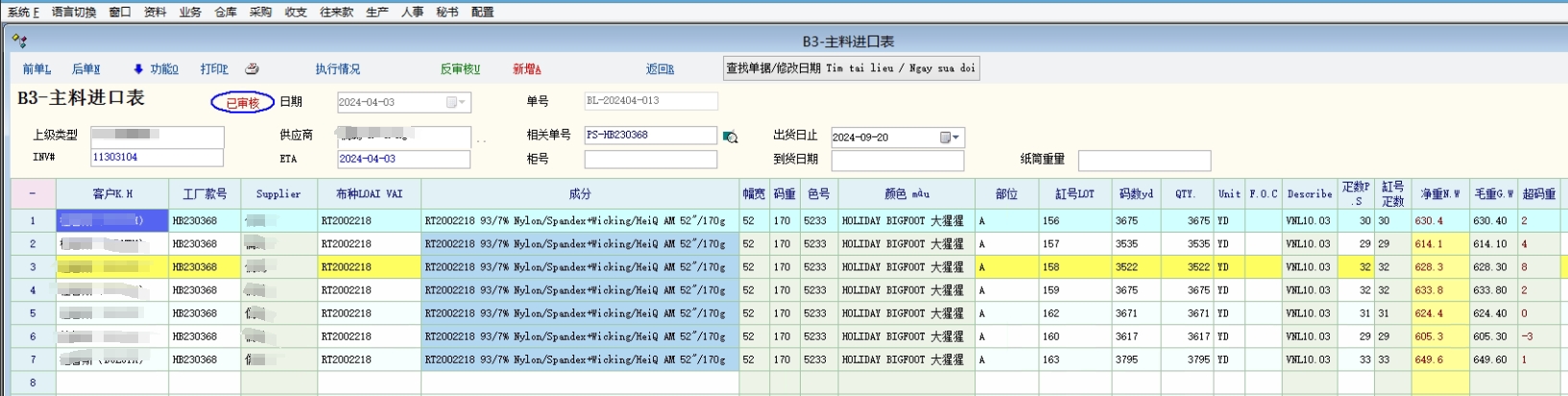 我们目前是提前录入客户提供的布料进口表,一个布种和颜色录入一个主料进口表单据,里面包含款号,布种,颜色,部位,缸号,总疋数,总码数等信息,打印出来作为来料验收清点的凭证,然后在把客户提供的详细缸号疋号信息导入到采购收货单据,打印物料标签出来,在卸货分缸的时候贴标签并核对原始标签上的布种,颜色,缸号,疋号,等信息是否无误