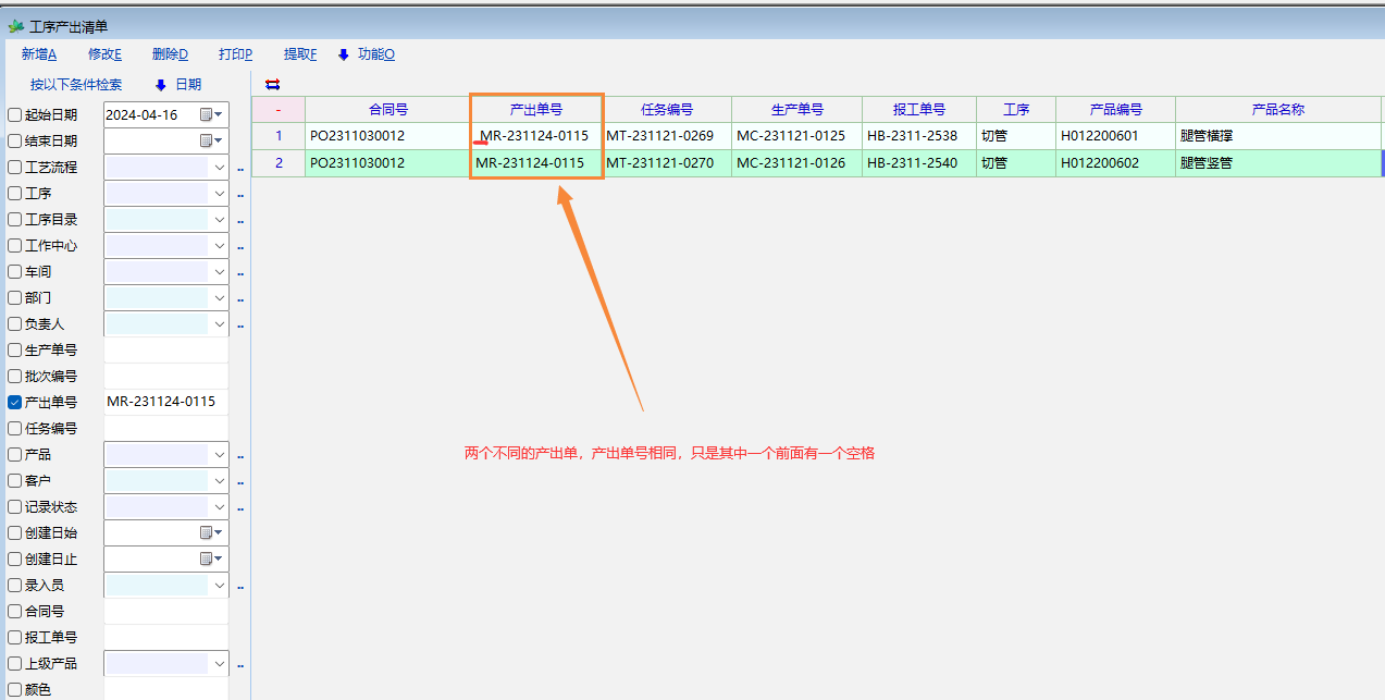 无意中发现系统中存在相同的产出单号,只是其中一个前面有空格,这会导致从sql数据库转换access数据库失败,这可能是操作员误操作导致的,因此建议派工单和产出单修改编号时不要直接修改,也要通过双击编号来修改,并且默认清除编号中的空格。