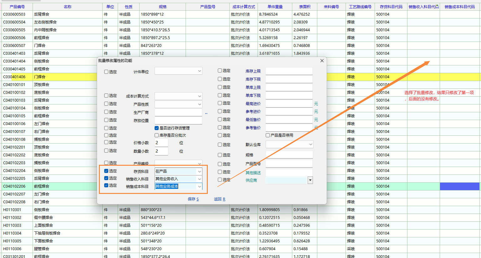 在产品资料列表中右键批量修改产品属性,选择了多项修改内容,结果只批量修改了第一项,其他项目没有修改。