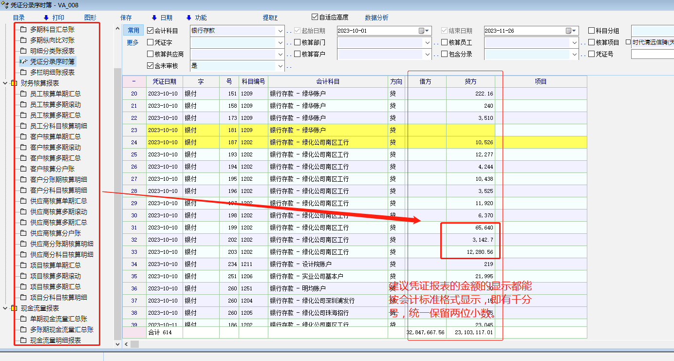 建议凭证报表金额栏统一用会计格式,即显示加千分号,保留两位小数。