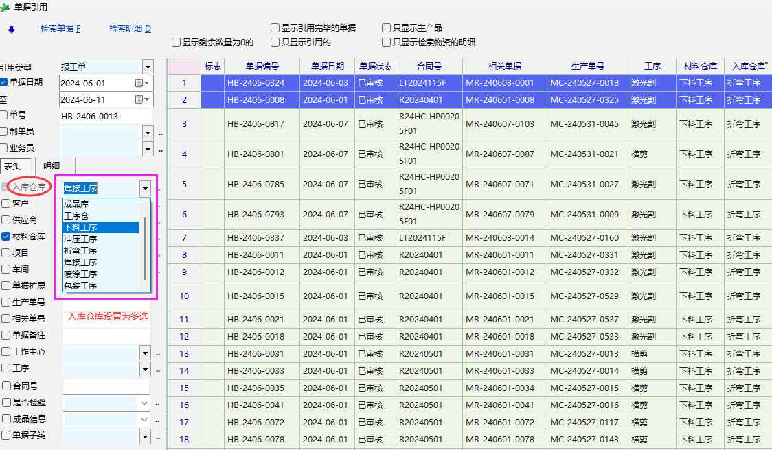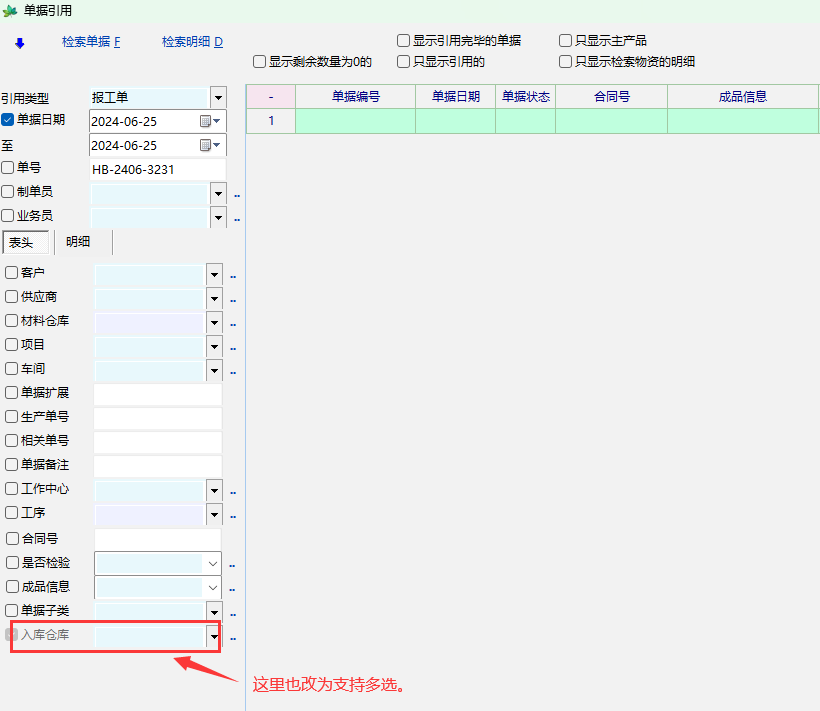 单据引用界面,仓库和工序支持多选希望老师支持一下。